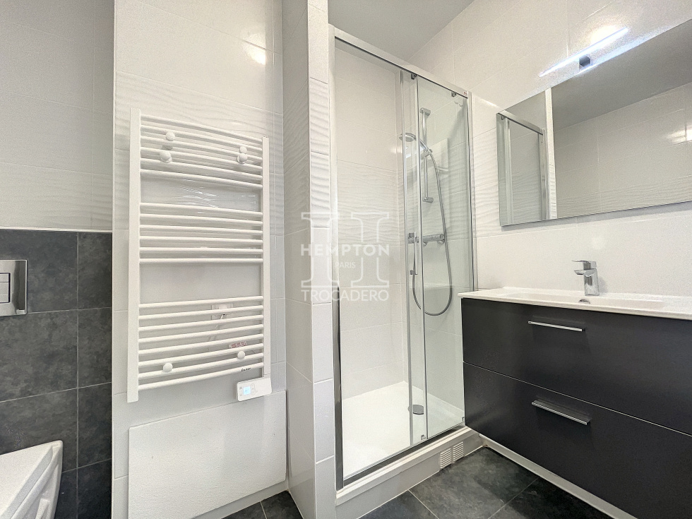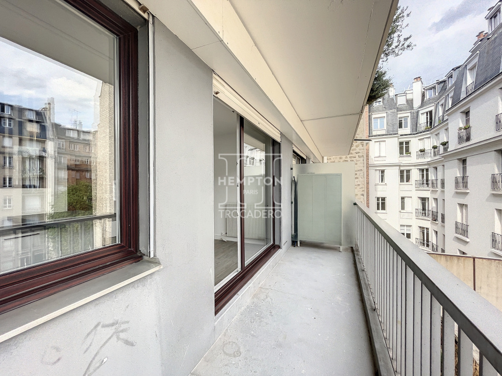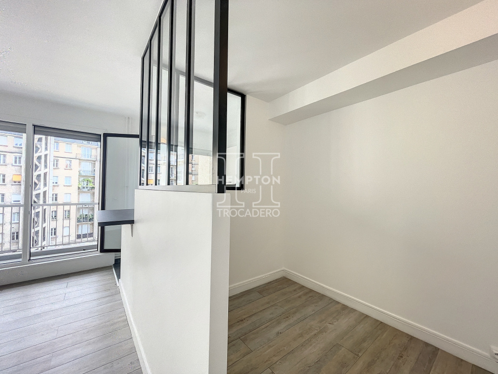 Hempton Paris Trocadéro vous propose un beau studio de 32m² se trouvant^ au 4° étage d'un immeuble datant des années 80. Il se compose d'une entrée avec placards, d'une pièce principale avec cuisine américaine aménagée et équipée, d'un coin nuit cloisonnée, d'une salle d'eau avec WC et d'un long balcon de 7m pouvant accueillir un canapé d'extérieur, une table et des chaises.