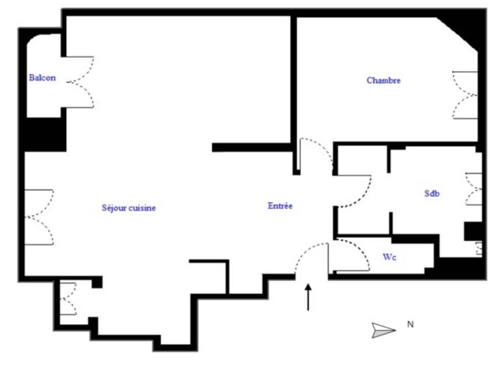 L’appartement se compose comme suit : une grande chambre, un spacieux séjour baigné de lumière grâce à une exposition sud-ouest, et une cuisine semie ouverte entièrement équipée avec électroménager mis à disposition. Hauteur sous plafond de 2,74 mètres.